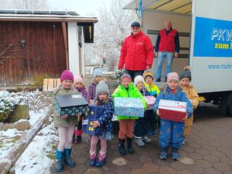 „Geschenk mit Herz“ ist bestimmt einigen ein Begriff – es werden Päckchen für Kinder gepackt, denen es nicht so gut geht wie uns. Die Kaufbeurer Hilfsorganisation beschenkt damit nicht nur Kinder im Ausland, sondern auch hier bei uns gibt es bedürftige Familien, denen diese Spende guttut. Auch 2024 machten wieder ein paar Familien aus unserer Kindertagesstätte St. Martin in Missen mit. Am 14.11.2024 kamen zwei Fahrer von humedica mit ihrem Lastwagen und die Kinder schleppten stolz die Päckchen nach draußen.