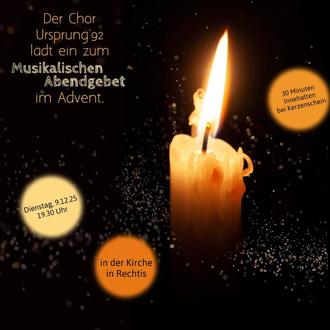 30 Minuten Innehalten bei Kerzenschein am Dienstag, 9. Dezember´25 um 19:30 Uhr in der Pfarrkirche St. Ulrich in Rechtis. Auf euer Kommen freut sich der Chor Ursprung´92 (ehem. Jugendchor Rechtis).
