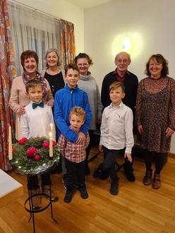 Haben dem Adventnachmittag ihre persönliche Note verliehen: von links nach rechts: Moni Möslang,Uschi Rimmel,Nikola Misiek,Cölestin Rudhard, Inge Rimmel. vorne: Franek, Kacper, Karol und Jan Misiek.