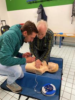 Torjäger übt Leben retten: German Stöhr und Herr Schwarz von Medizintechnik Schwarz