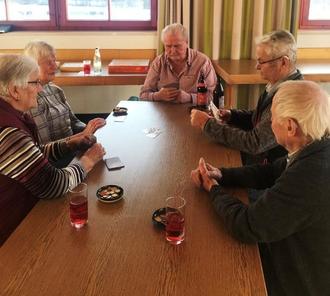 Es dauerte nicht lang, bis die Fröhlichkeit beim Spielen zu spüren war. Lachen, Freude, Spaß und Unterhaltung an jedem Tisch. Die Schafkopfspieler waren hoch konzentriert und wurden aufgeschreckt durch lautes Lachen unseres Seniorenteams, die auch an einem extra Tisch sich mit Memoire quälten und feststellten, dass unsere Kinder und Enkelkinder doch eine schnellere umsetzbare Merkfähigkeit haben.