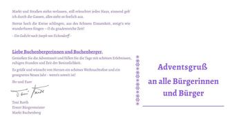 wir möchten Sie darüber informieren, dass es beim diesjährigen Weihnachtsgruß des Bürgermeisters bei der Verteilung an die Haushalte durch die Deutsche Post zu Problemen kam. Versehentlich wurde ein Teil der Karten von der Post in einer Nachbargemeinde verteilt. Dieser Anteil fehlt somit unserem Gemeindegebiet. Wenn auch bei Ihnen leider keine Zustellung erfolgt ist, können Sie den Weihnachtsgruß des Bürgermeisters an allen öffentlich ausliegenden Stellen in Buchenberg erhalten.