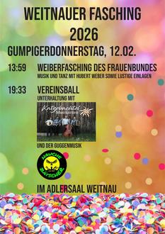 Am 12. Februar wird der Adlersaal in Weitnau zum Schauplatz des diesjährigen Faschings. Um 13:59 Uhr beginnt der Weiberfasching mit Musik und Tanz. Ab 19:33 Uhr findet der Vereinsball von Musik, Schützen und Feuerwehr statt. Für gute Stimmung sorgen die Katzebachtel Musikanten und die Hauchebätscher. Für alle, die von Anfang bis Ende feiern wollen, gibt es ab 17:00 Uhr warmes Essen.