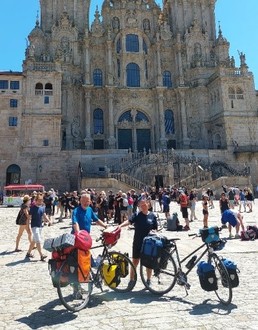 Vollbepackt und mit strammen Waden: Heidi und Reiner mit ihren Rädern in Santiago de Compostela