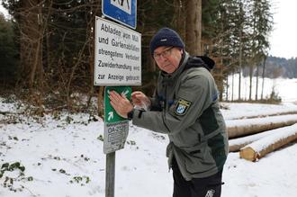Rettungstreffpunkte 1: Revierförster Michael Balk beklebt ein Schild am Rettungstreffpunkt im Wald bei Waltenhofen-Oberdorf. Durch Witterungseinflüsse verblassen die Aufdrucke und müssen regelmäßig kontrolliert werden. (Foto: Anna Munkler)