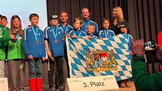 Neben dem ganzen Rummel blieben aber die Sprungwettkämpfe im Fokus und waren der Höhepunkt der vier Tage. Insgesamt nahmen 62 Athleten (12 Teams) der Jahrgänge 2014 und 2015 aus ganz Deutschland teil. Beim Einzelspringen am ersten Wettkampftag zeigte Jan Misiek bereits sein großes Talent- mit Sprüngen auf 18,5 und 19,0 m belegte er einen beeindruckenden 6. Platz. Thaddäus Wehr sprang zwar kürzer, erhielt jedoch bei perfekter Landung hohe Haltungsnoten und kam auf einen guten Platz im mittleren Starterfeld (37.). Am nächsten Tag folgte das Mannschaftsspringen. Drei Teilnehmer bildeten ein Team. Jan startete für „Bayern West 1“ und Thaddäus für „Bayern West 2“. Furios sprang Jan Misiek auch an diesem zweiten Tag, mit der zweitbesten Leistung des Tages gewann sein Team das Mannschaftsspringen. Thaddäus erreichte mit seinen Kollegen den 13. Platz. Im Endergebnis der beiden Tage gelang damit dem Team“ Bayern West“ durch eine wirklich starke Gemeinschaftsleistung der Sprung aufs Podest. Hinter Team „Vogtland/Erzgebirge“ und Team „Inselberg“ sicherten sie sich die Bronzemedaille. Für Jan und Thaddäus war dies der erste Wettkampf, bei dem sie sich mit Sportlern aus ganz Deutschland messen durften. Neben vielen Eindrücken hinterließ dieses Erlebnis sicher auch viel Motivation für das Training und die noch kommenden Wettkämpfe!