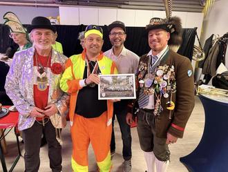 Das "Mombacher Bohne-Corps" überreichte Bazi-Organisator Volker Schmidt ihren Jubiläumsorden und ein Gruppenbild der Garde. v. links n. rechts: 2. MBC-Präsident Toralf Kahl, Initiator Thorsten Albert, MBC-Präsident Uwe Ferger, Bazi-Manager Volker Schmidt