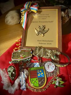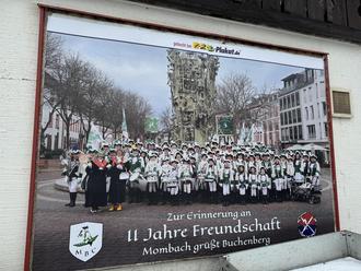 Auch das befreundete „Bohne-Corps“ mit ihrem Initiator Thorsten Albert überreichte den 12 Musikanten den Jubiläumsorden, denn ebenfalls vor 11 Jahren wurde die Garde ins Leben gerufen. Indes hat sich auch im Heimatort der Bazis viel getan: Auf einer 5m x 6m großen Werbetafel auf der Südseite des Sportgeschäfts Frey wurde das neue Gruppenbild der Mainzer Garde angebracht, mit dem Gruß „Zu Erinnerung an 11 Jahre Freundschaft – Mombach grüßt Buchenberg“. Dies war wohl die schönste Freundschafts-Geste der Mainzer, die zu einem Gänsehauteffekt für die überraschten Buchenberger führte!