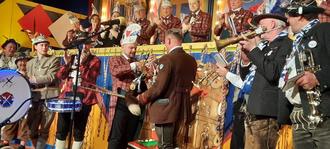 Dabei ließen sich die Gastgeber so einige Überraschungen für die Buchenberger einfallen. Bereits bei ihrem Eintreffen am Fastnachtssonntag auf der Narrensitzung der Mombacher Bohnebeitel wurden die Bazis vom Bühnenregisseur Andreas Lippek mit den diesjährigen Vereins-Orden „140 Jahre Bohnebeitel“ bestückt. Sogleich ging es dann auf die Bühne der „Mombacher Narrhalla“, auf der die Blasmusikanten die Stimmung der 750 maskierten Gäste anheizten.