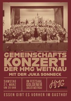 Die HMG Weitnau lädt Sie recht herzlich zum diesjährigen Gemeinschaftskonzert mit der JuKa Sonneck am 21. März in den Adlersaal in Weitnau ein. Es erwartet Sie ein abwechslungsreiches Programm, das von Marsch über Polka bis hin zu modernen Werken alles beinhaltet.