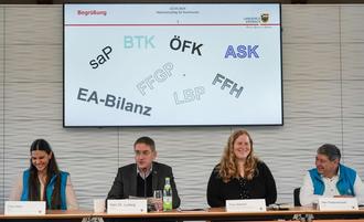 Naturschutz kann Spaß machen. Landrat Dr. Jürgen Ludwig (Zweiter von links) fühlte sich beim Naturschutztag im Landratsamt angesichts der vielen fachlichen Abkürzungen an die „Fantastischen Vier“ erinnert. Neben ihm nahmen Eva Klein, Melanie Dietrich und Joachim Federschmidt (von links) als weitere Vertreter des Landratsamtes auf dem Podium Platz. Foto: Landratsamt Ansbach/Fabian Hähnlein