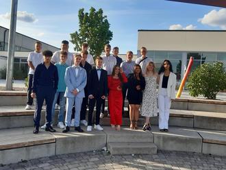 Aus der Klasse 9G wurden in diesem Jahr 20 Schüler im Rahmen einer Feierstunde im Pausenhof der GMS Bechhofen verabschiedet. Dazu hatten die Schüler ihre Familien und Lehrer eingeladen, die Lehrerband sorgte für die musikalische Gestaltung. Alle Schüler konnten mit dem Abschluss der Mittelschule entlassen werden, fast 70 Prozent hatten durch eine besondere Leistungsfeststellung den Qualifizierenden Abschluss der Mittelschule erreicht. Als beste Schüler wurden Alina Gschrey mit einem Notendurchschnitt von 2,2 und Elias Ölen mit 2,5 hervorgehoben. In seiner Begrüßungsrede dankte Rektor Gerhard Bräunlein Eltern und Lehrern für die Begleitung der Schüler, der Schulabschluss sei ein erster Schritt auf dem Weg zum Erfolg im Leben. Im Namen der Schüler blickten Alina Gschrey und Rawan Albadri auf ihre Schulzeit zurück. Sie drückten ihren Stolz und ihre Freude über die bestandenen Prüfungen aus und bedankten sich ihrerseits mit jeweils einer Rose bei ihren Eltern und den Lehrkräften. Ihre Mitschüler forderten sie auf, Verantwortung für ihr Leben zu übernehmen. Als Klassenlehrerin der 7. Und 8. Klasse wünschte Sabrina Bayer den Schülern und Schülerinnen alles Gute, Heidemarie Fäller überbrachte als Klassleitung in der 9. Klasse herzliche Glückwünsche. Das Glück im Leben falle einem meist nicht einfach zu, man müsse danach suchen und könne aktiv etwas dafür tun. Dennoch habe man viele Dinge auch nicht in der Hand und so wünschte sie den Jugendlichen Gottes Segen und viel Glück für ihre Zukunft. Zur Erinnerung an ihre Schulentlassung bekam jeder mit seinem Zeugnis einen Schlüsselanhänger mit seinem Namen und einem vierblättrigen Kleeblatt als Glückssymbol, hergestellt von der neugegründeten Schülerfirma. Zum Schluss wurde den Gästen noch eine Präsentation mit Bildern von den Ereignissen in der 9. Klasse gezeigt, musikalisch unterlegt mit dem Lied „Final Countdown“.