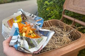 Unter anderem Zeitungspapier eignet sich in Maßen als geruchshemmende „Zugabe“ in der Biotonne. (siehe Bild: Biotonne im Sommer)