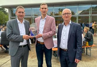 Landrat Dr. Jürgen Ludwig übergab den Innovationspreis des Landkreises Ansbach an Christoph Heubeck (Mitte), Geschäftsführer der TVU-Gruppe in Leutershausen. Zu den ersten Gratulanten zählte Thomas Merkel von der Wirtschaftsförderung am Landratsamt Ansbach (rechts).