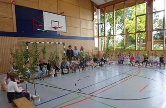 Eine besondere Aktion zum Schulanfang bereitete das Lehrerkollegium der Eichelbergschule mit Schulleiterin Heidrun Townson und Bürgermeister Jürgen Nägelein den 30 ABC-Schützen. Schulleiterin Townson begrüßte die aktuellen Erstklässler und der Schulchor der sang das Lied „Keiner muss hier alles können“ unter Begleitung von der Schulleiterin an der Gitarre und am Klavier spielte Ulla Hagen. Für die erste Pause des neuen Schuljahres hatte der Elternbeirat in der Eichelberghalle ein reichhaltiges Frühstücksbüffet aufgebaut. Mit einem herzlichen „Hallo“ begrüßte Bürgermeister Jürgen Nägelein die neue Schülerschar aus dem gesamten Gemeindegebiet von Arberg und führte aus, dass heute ein großer Tag gekommen sei, denn nach der Vorschule beginne ein neuer Lebensabschnitt. Der Bürgermeister überreichte an alle Erstklässler einen Obstbaum zum Einpflanzen im eigenen Garten der Eltern. Zur Auswahl standen Apfel-, Birnen- und Zwetschgensetzlinge die vom Bürgermeister gespendet worden waren. In seinem kurzen Statement wandte sich Nägelein an die versammelte Schüler-, Lehrer-, Eltern- und Bürgerschaft und verwies auf die Funktion der Bäume und die wohlschmeckenden Früchte die aus dem eigenen Garten geerntet werden können. Alle derzeit die Eichelbergschule besuchenden Schülerinnen und Schüler hätten bereits zum Schulanfang ein Bäumchen zum Schulanfang bekommen. Erfreulich sei auch, dass alle Lehrerstellen besetzt sind und wie im vorherigen Schuljahr wiederum zwei erste Jahrgangsklassen gebildet werden können.
