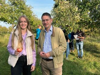 Maria Wenk begleitete Landrat Dr. Jürgen Ludwig durch seinen Arbeitstag. Dazu gehörte auch ein Pressetermin auf einer Streuobstwiese bei Leutershausen. Foto: Landratsamt Ansbach/Fabian Hähnlein