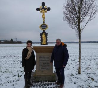 Zweckverbandsvorsitzende Dorinna Jechnerer und Bürgermeister Näglein überzeugten sich von der ausgezeichneten Wiederherstellung des Feldkreuzes, das an der Straße nach Ornbau steht.