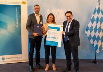 ERH-Geschäftsführer Stefan Bach (links) und Regionalmanagerin Anuschka Hörr freuen sich über den Zuwendungsbescheid aus den Händen von Staatssekretär Tobias Gotthardt [Bildrechte: StMWi/E. Neureuther]