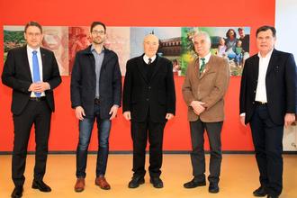 Landrat Dr. Jürgen Ludwig (links) und die Bürgermeister Manuel Döhler (Zweiter von links) sowie Gerhard Rammler (rechts) gratulierten Wolf Burger und Horst Lange (Zweiter von rechts) zum Ehrenzeichen des Bayerischen Ministerpräsidenten.