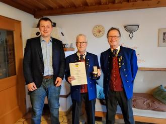 Die Gemeinde ehrt jedes Jahr Mitglieder eines eingetragenen Vereins aus dem Gemeindegebiet für besondere Verdienste. Im Dezember 2022 hat der Gemeinderat den Vorschlag des Trachtenvereins, der über Vorstand Helmut Jungbeck bei der Gemeinde eingereicht wurde, angenommen. Im Rahmen einer kleinen Feierstunde bei Max Müller zu Hause überreichte Bürgermeister Johannes Vogl die Auszeichnung mit Urkunde und Ehrenzeichen in Gold.