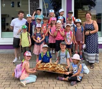 Erinnerungsfoto mit den Vorschulkindern, Bäckermeister „Seppe“ und Kindergartenleiterin Stephanie Preuß