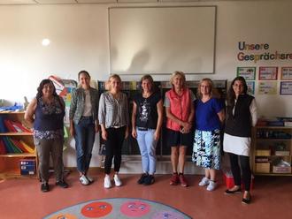 Die Lehrkräfte an unserer Grundschule stellen sich für das aktuelle Schuljahr wie folgt dar (von links nach rechts): Frau Gisela Frisch erteilt Ethikunterricht und differenziert in den beiden Kombiklassen. Frau Anja Greipl ist die Klassenleiterin der Klasse 1/2b, Frau Susanne Karmann leitet die Schule und unterstützt ebenfalls in den Kombiklassen sowie in Klasse 4. Frau Regina Lankes-Vieth führt die Klasse 1/2a. Frau Irmgard Heiland-Dassing unterrichtet im Fach Sport sowie Werken und Gestalten. Frau Anja Weikl ist gemeinsam mit Klassenleiterin Jana Klement (fehlt auf dem Bild) in der 3.Klasse tätig. Frau Andrea Weiß hat die Leitung der Klasse 4 inne. Nicht auf dem Bild sind auch unsere Religionspädagogin Frau Kerstin Huber, Differenzierungskraft Frau Helga Klement sowie die zweite Fachkraft für Werken und Gestalten Frau Lisa Hofbauer.