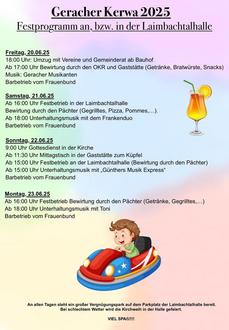 vom 20.06.2025 bis 23.06.2025 feiert die Gemeinde Gerach ihr Kirchweihfest. Eröffnet wird die Kirchweih am Freitag, 20.06.2025 um 17:00 Uhr, mit dem Festbetrieb am Parkplatz der Laimbachtalhalle. Die Bewirtung wird wie alle Jahre vom OKR durchgeführt. Aufstellung des Umzuges mit den Vereinen und dem Gemeinderat ist um 17:45 Uhr am Bauhof. Ab 18:00 Uhr spielen die Geracher Musikanten. Zur Unterhaltung ist an allen Tagen ein großer Vergnügungspark für Jung und Alt an der Laimbachtalhalle aufgebaut. Für Speis und Trank wird an allen Tagen gut gesorgt sein. Ebenso findet an allen Tagen wieder der Barbetrieb vom katholischen Frauenbund statt. Ich lade die Gesamtbevölkerung unserer Gemeinde und alle Gäste aus nah und fern zu unserem Kirchweihfest ein und wünsche harmonische und fröhliche Kirchweihtage in unserem schönen Gerach.