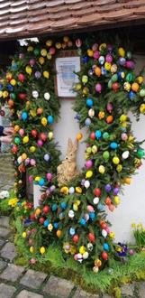 In vielen Gemeinden werden zur Osterzeit Brunnen mit buntbemalten Eiern und Girlanden dekoriert. So auch bei uns in Reckendorf. In der Bahnhofstraße ziert zur Osterzeit der aufwendig geschmückte Osterbrunnen unseren Ort.