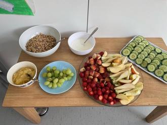 Damit die Kinder in der Kita Regenbogen verschiedene Lebensmittel kennenlernen, wird immer donnerstags ein gesundes Frühstück angeboten. Dafür wird ein Frühstücksbuffet im Kinderbistro gemeinsam mit den Kindern aufgebaut. Die kommenden vier Wochen werden wir dabei von Kulinarix (Raps Stiftung) begleitet. Dabei werden mit den Kindern die verschiedenen Lebensmittel intensiv besprochen und erarbeitet. Im Anschluss wird eine Mahlzeit zubereite. Zuletzt wird das Buffet angerichtet und im Anschluss gemeinsam gefrühstückt.