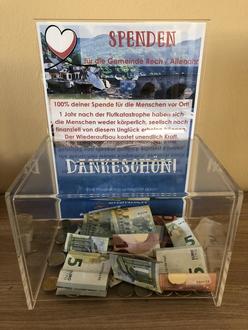 Es wurden Spendenboxen an verschiedenen Stellen in Baunach aufgestellt. Der Erlös kommt direkt den Menschen vor Ort zu Gute. Die Verwaltungsgemeinde Altenahr hat ein Spendenkonto eingerichtet. Hier werden ihre Spenden zu 100 % eingezahlt.