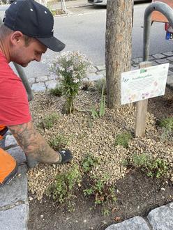 Die Beete in der Überkumstraße werden komplett mit Stauden zuwachsen, sodass der Split später kaum mehr zu sehen ist. Der Split wird außerdem nur wenige Zentimeter dick aufgetragen. Durch diese Gestaltung werden die Beete nur wenig Hitze abstrahlen und das Oberflächenwasser kann leicht in das Pflanzsubstrat (Humusschicht) versickern.