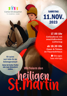 Am 11.11.2023 ziehen wir wieder gemeinsam im Martinszug durch die Straßen. St. Martin und sein Pferd führen uns nach der Kirche von dort in die Schulstraße – Hauptstraße – Birkenstraße – Rosenweg – In der Au – Dorfplatz – Schulstraße und zum Schluss in das Feuerwehrhaus.