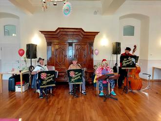 Der „Kemmärä Kuckuck“, vier Volksmusiker aus Kemmern, eröffneten mit vielen beliebten und bekannten Stimmungsliedern um 10:00 Uhr das Faschingsprogramm im bunt geschmückten Speisesaal. Zwischen den Liedern sorgte der Bandleader und „Kopf der Bande“ Dieter Ruß mit lustigen Anekdoten und Witzen für eine extra Portion guter Stimmung im Seniorenzentrum.