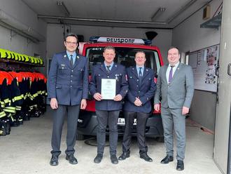 Bei der Ehrung gratulierten nicht nur sein Erster Kommandant Marcel Martin, sondern auch der Kreisbrandrat Thomas Renner und Bürgermeister Ronny Beck, der die Ehrung vornehmen durfte.