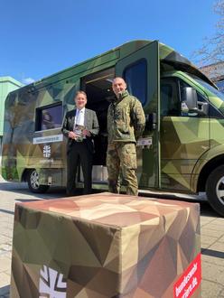 Im Karrieremobil der Bundeswehr können sich Interessierte über die Ausbildungs- und Studienmöglichkeiten der Bundeswehr informieren. Landrat Dr. Jürgen Ludwig (links) begrüßte hierfür Stabsfeldwebel Mario Thurn auf dem Gelände des Landratsamtes Ansbach.