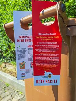 Eine rote Karte an der Biotonne signalisiert, dass der Behälter nicht geleert wurde. Jetzt heißt es nachsortieren.