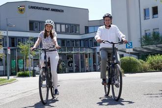 Treten für das STADTRADELN kräftig in die Pedale: Landrat Dr. Jürgen Ludwig und Lena Navarro Ortiz, Klimaschutzmanagerin des Landkreises Ansbach.