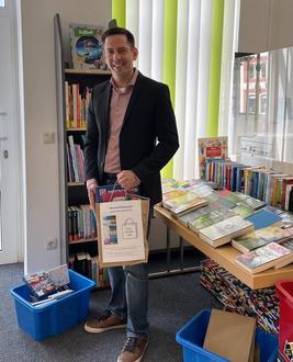 Zum Auftakt hat Bürgermeister Sven Waidmann den Flohmarkt besucht und unterstützt die Aktion der Bücherei.