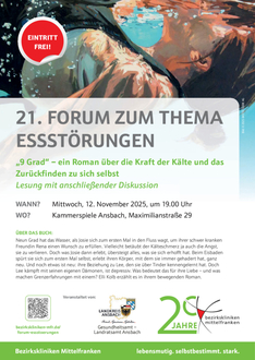 Essstörungen zählen zu den häufigsten psychischen Erkrankungen – gerade bei jungen Menschen. Um Aufklärung zu fördern und den Austausch zwischen Fachkräften, Betroffenen und der Öffentlichkeit zu stärken, laden das Bezirksklinikum Ansbach und die Beratungsstelle „Strohhalm“ am Gesundheitsamt Ansbach ein zum 21. Forum Essstörung am Mittwoch, den 12. November 2025 um 19.00 Uhr in die Kammerspiele Ansbach (Maximilianstraße 29, 91522 Ansbach).