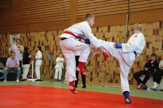 Mit einem kraftvollen Fußstoß kontert Elias Wiedemann (rechts im Bild) den Angriff seines Gegners.