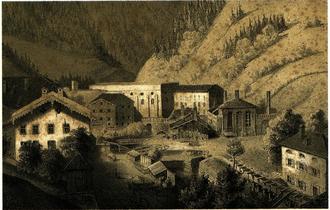 Die Maxhütte zu Zeiten des Königsbesuchs 1848. Die Puddlingshütte (Ederhalle) wurde 1834 - 1836 erbaut, der westliche Anbau, die neue Hammerhütte, 1842/43.