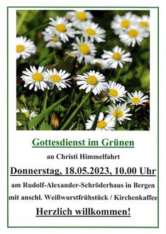 | 10.00 Uhr | Gottesdienst im Grünen in Bergen, R.-Alexander-Schröder-Haus, |