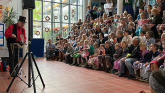 Den Abschluss bildete dann eine Überraschung des Kindergartenteams für die Kinder und Familien. Zauberer Scharini verzauberte mit einer tollen Show in der Schulaula die Besucher. Schon war ein gelungener Nachmittag zu Ende.