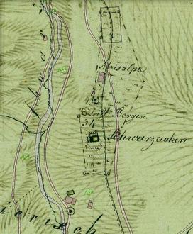 Kartenausschnitt von 1830 mit Kohlstätten nahe der Schwarzachenalm (= Wirtsalm)