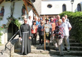 Hinter dem Kreuz, mit Pater Adrian Cobzaru und Franz Kastner (Binder Franz) als Vorbeter pilgerten die Gläubigen mit Gebet, aber auch mit Stille vorbei am „Herrn am Kreuz“ wo etwa in der Mitte der Wegstrecke eine kurze Pause eingelegt wurde. Angekommen in Maria Eck feierten die Pilger die Heilige Messe - zusammen mit den vielen anderen Wallfahrern die von Bergen aus auf andere Weise nach Maria Eck gekommen waren.