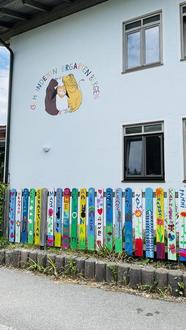 Als Erinnerung durfte sich jedes Vorschulkind auf einer Zaunlatte im Kindergarten verewigen. Seit 2020 malen die Kinder fleißig die Latten an und es entstand schon ein langer bunter Zaun auf der Nordseite.