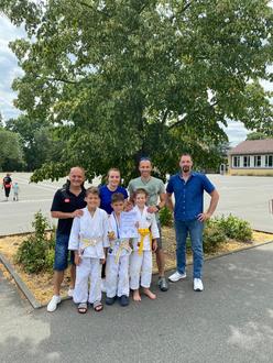 Das Betreuer- und Trainerteam des TSV Bergen mit dem Ju-Jutsu-Nachwuchs (v.l.n.r.:) Nazarii Trufen, Mykhailo Trufen und Anton Köhler im Vordergrund.