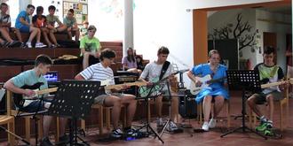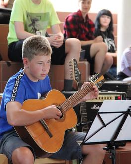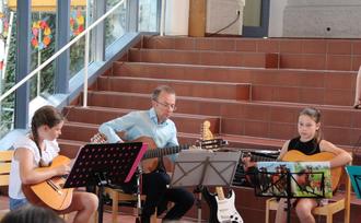 Mit einem Programm, das klassische Musik, Filmmusik und Rockmusik beinhaltete, unterhielten die Gitarrenschüler von Alfred Schillmeier ihr Publikum am Spätnachmittag des zweiten Julisamstages. Die Aula war sehr gut besucht, als das erste Ensemble bestehend aus acht Spielern den musikalischen Ablauf startete, mit einem bekannten Klavierstück von Ludwig van Beethoven - „Für Elise“ - aber arrangiert für Gitarren, gefolgt von zwei Stücken aus dem Barock, sowie dem Beatles-Titel „Nowhere Man“. Die zweite Gruppe (auch acht Teilnehmer), präsentierte vier „Lieblingslieder“ der jüngeren Gitarrenschüler, nämlich die berühmte „Ode an die Freude“ (Beethoven), ein spanisches Thema mit Rasgueado-Begleitung, einen Blues und das Traditional „Banks Of Ohio“. Sofi und Bene Holzner spielten dann „My Heart Will Go On“ aus dem Film „Titanic“ und die nächste „Melodie rief“ bei dem einen oder anderen älteren Zuhörer „Jugenderinnerungen hervor“ (Zitat): das Winnetou -Thema von Martin Böttcher aus dem gleichnamigen Film. Nach der Popmusik - Ballade „Woman In Love“, gespielt von Florentine Zellner und Chris Hammerer, gab es zwei Nirvana-Nummern zu hören, „Come As You Are“ und „Smells Like Teen Spirit“, in stilgemäßem Groove vorgetragen von vier Akustik-, zwei E-Gitarristen und einem Bassisten. Mit einem Metal-Klassiker ging es weiter, „Enter Sandman“ von Metallica, der von Maxi Greil und Jan Diener zusammen mit ihrem Gitarrenlehrer auf ihren E-Gitarren angeschlagen wurde, jedoch dynamisch abgestuft, klanglich differenziert, rhytmisch ausgearbeitet - und der einen starken Applaus seitens des Publikums zur Folge hatte. „Megalomaniac“ von Incubus, „Well All Right“ von Carlos Santana und der Bluesklassiker „Hideaway“ von Freddy King rundeten das offizielle Programm ab, bevor zwei Zugaben ebenso vom „Electric Guitar Ensemble“ der Musikschule Traunstein mit ihrem virtuosen Leadgitarristen, dem Bergener Gitarrenschüler Marco Berndl gespielt, den Schlußpunkt setzten.