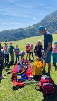 Als große Überraschung wartete die Bergwacht mit ihrem Einsatzfahrzeug und spendierte Brezn für die Kinder. Der eine oder andere versuchte einen Karabiner zu öffnen oder die schwere Trage zu heben. Mit viel Geduld zeigten uns die Bergwachtler ihre Ausrüstung.
