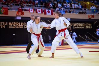 In der Klasse Ju-Jutsu "Duo" Women U18 traten vom TSV Bergen die amtierenden Deutschen Meister Lisa Nigl und Veronika Koch-Sappl an. Mit vier Stunden Zeitverschiebung begann der Wettkampftag um 04:00 Uhr morgens deutscher Zeit für das Duo-Paar mit dem Schlimmstmöglichen, was einem Athleten passieren kann: in der Aufwärmphase verletzte sich Koch-Sappl äußerst kritisch am Sprunggelenk. Nur durch die professionelle Unterstützung des mitgereisten deutschen medizinischen Teams konnte Athletin unter Schmerzen antreten. Das hinderte das deutsche Duo-Paar jedoch nicht, gleich in der ersten Poolrunde das zweitbeste Ergebnis mit 139 Punkten hinter den Griechen Maria Siedera & Alexandra Siedera (Vize-Europameister 2022) mit 149 Punkten abzuliefern.